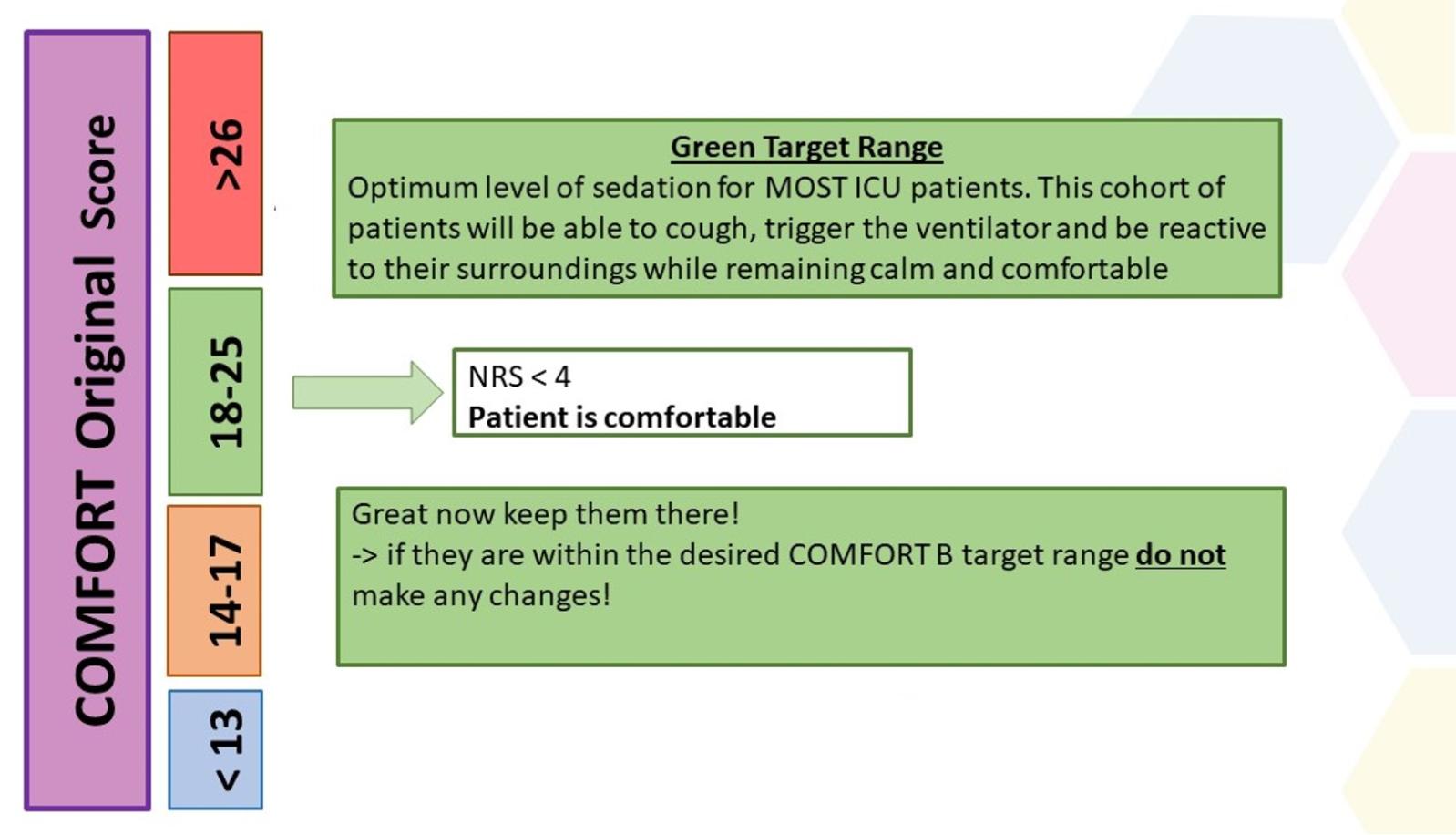 Please click on the drop down sections below to get an explanation of each of the COMFORT O score target zones and what to do to achieve them.